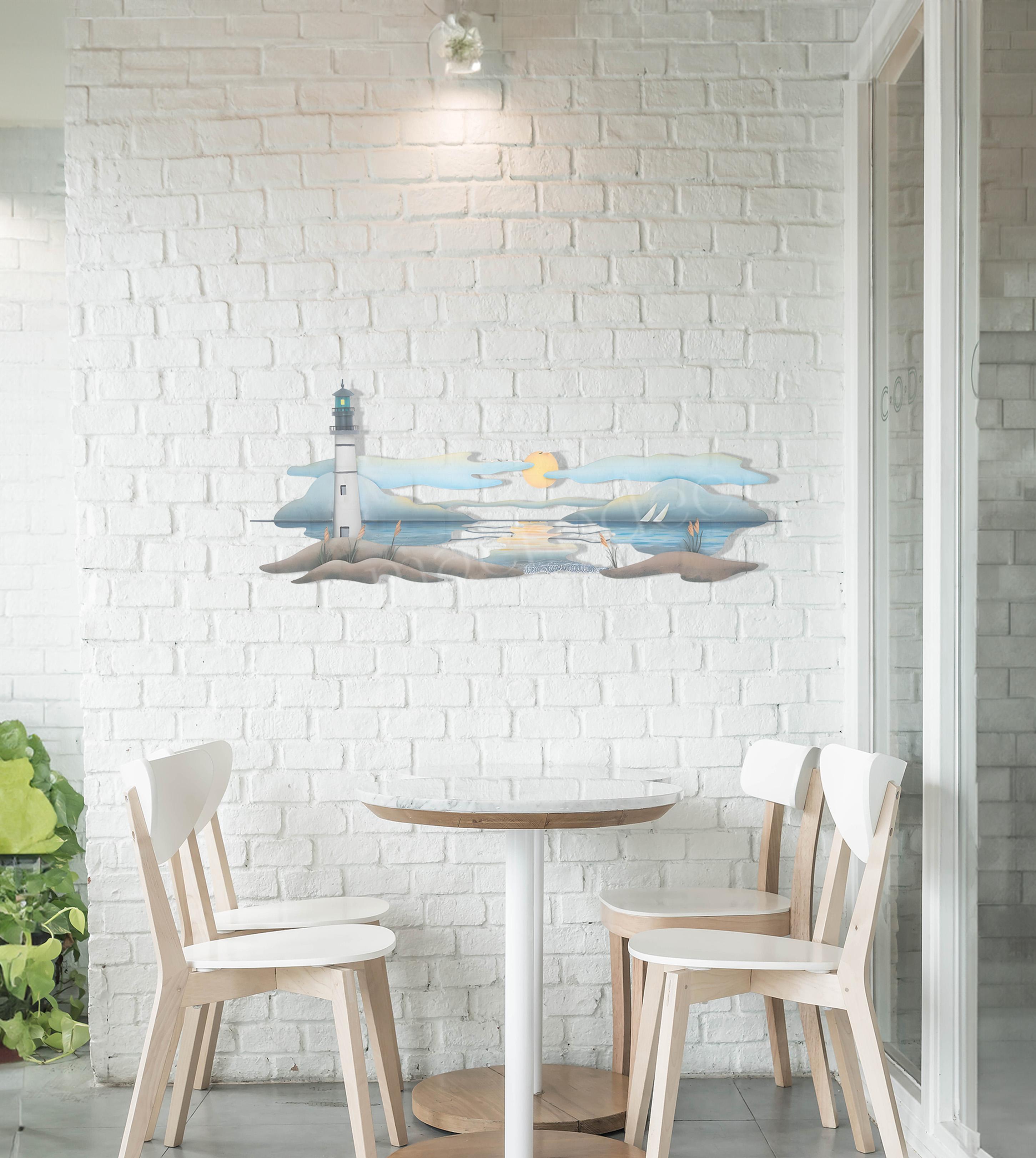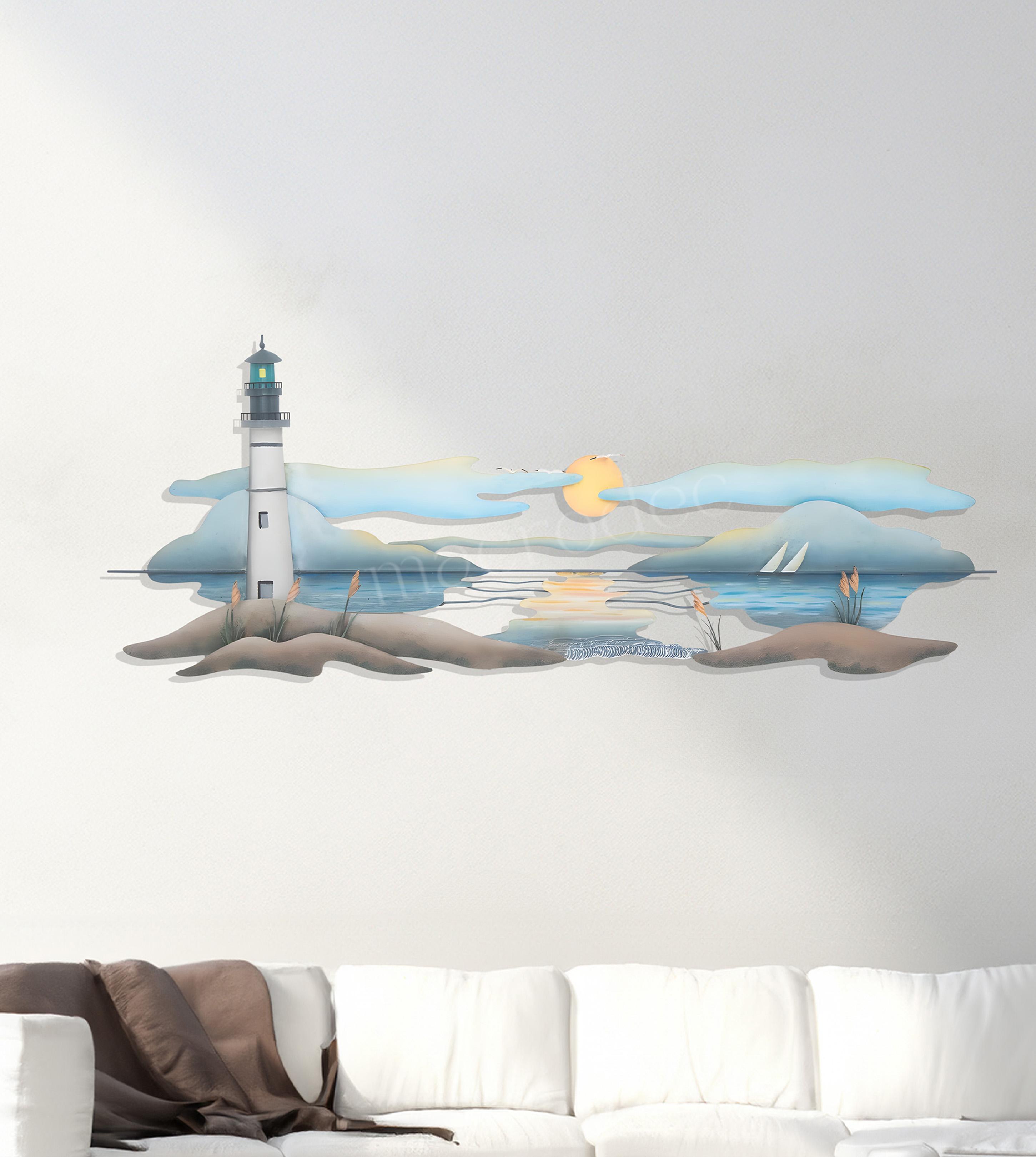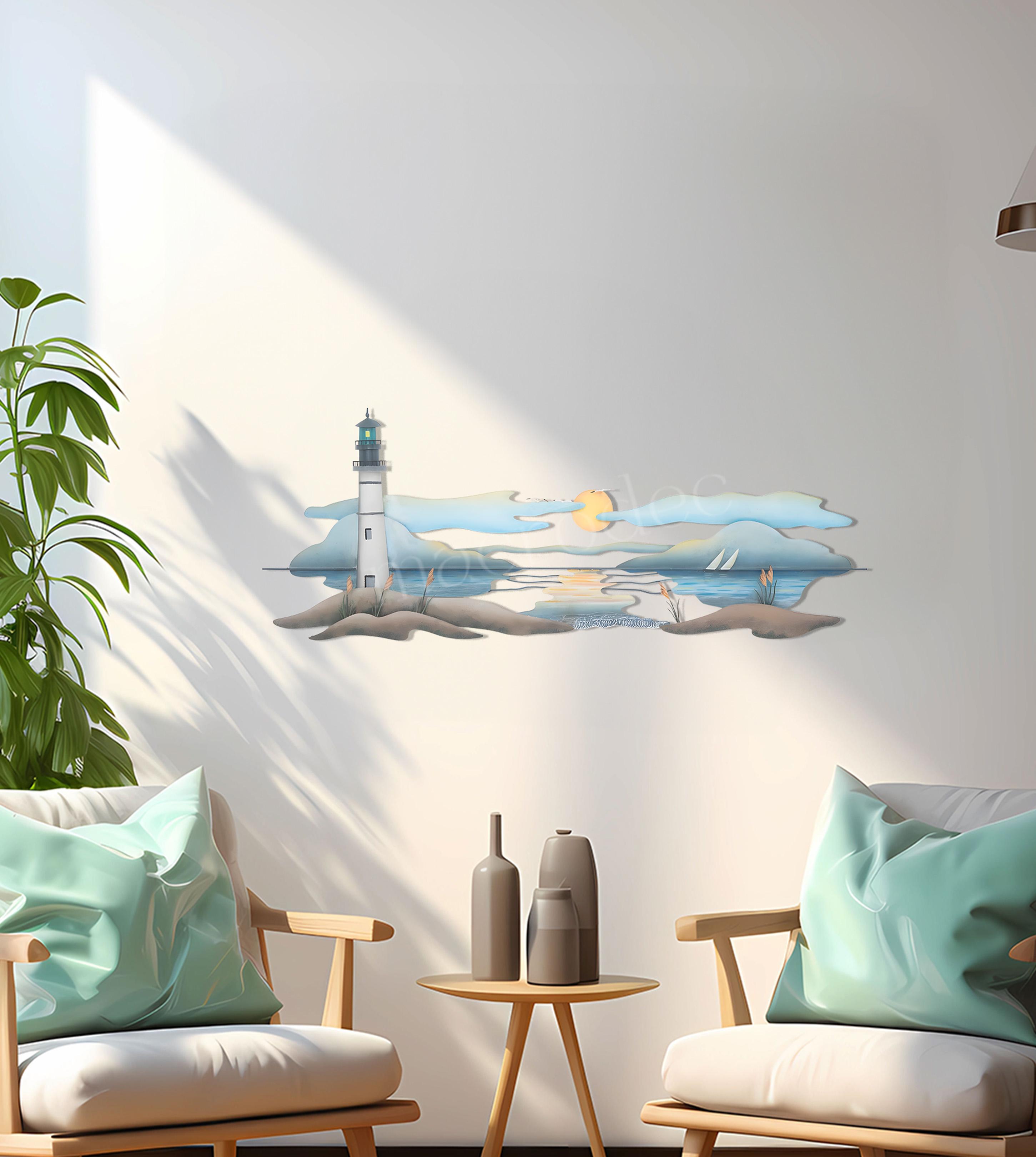 Deniz feneri, sahil kumulları, yelkenli ve gün batımının suya yansıyan ışıkları; modern metal işçiliğiyle detaylandırılmıştır.