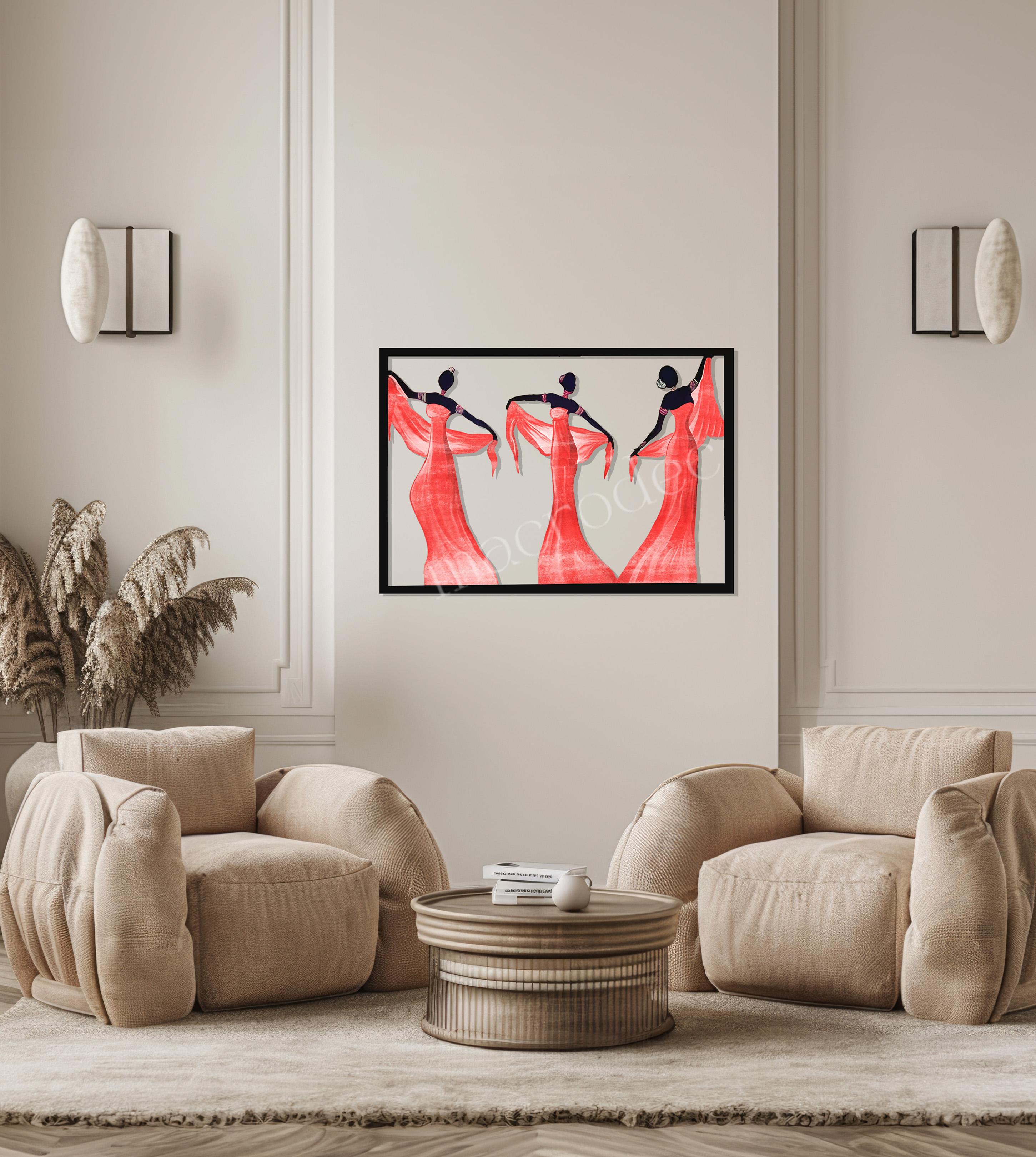 Zarafet, ritim ve renklerin büyüleyici etkisini bir araya getiren Scarlet Dancers Metal Tablo, dans eden üç figürün akıcı silüetlerini modern bir sanat diliyle sunar.