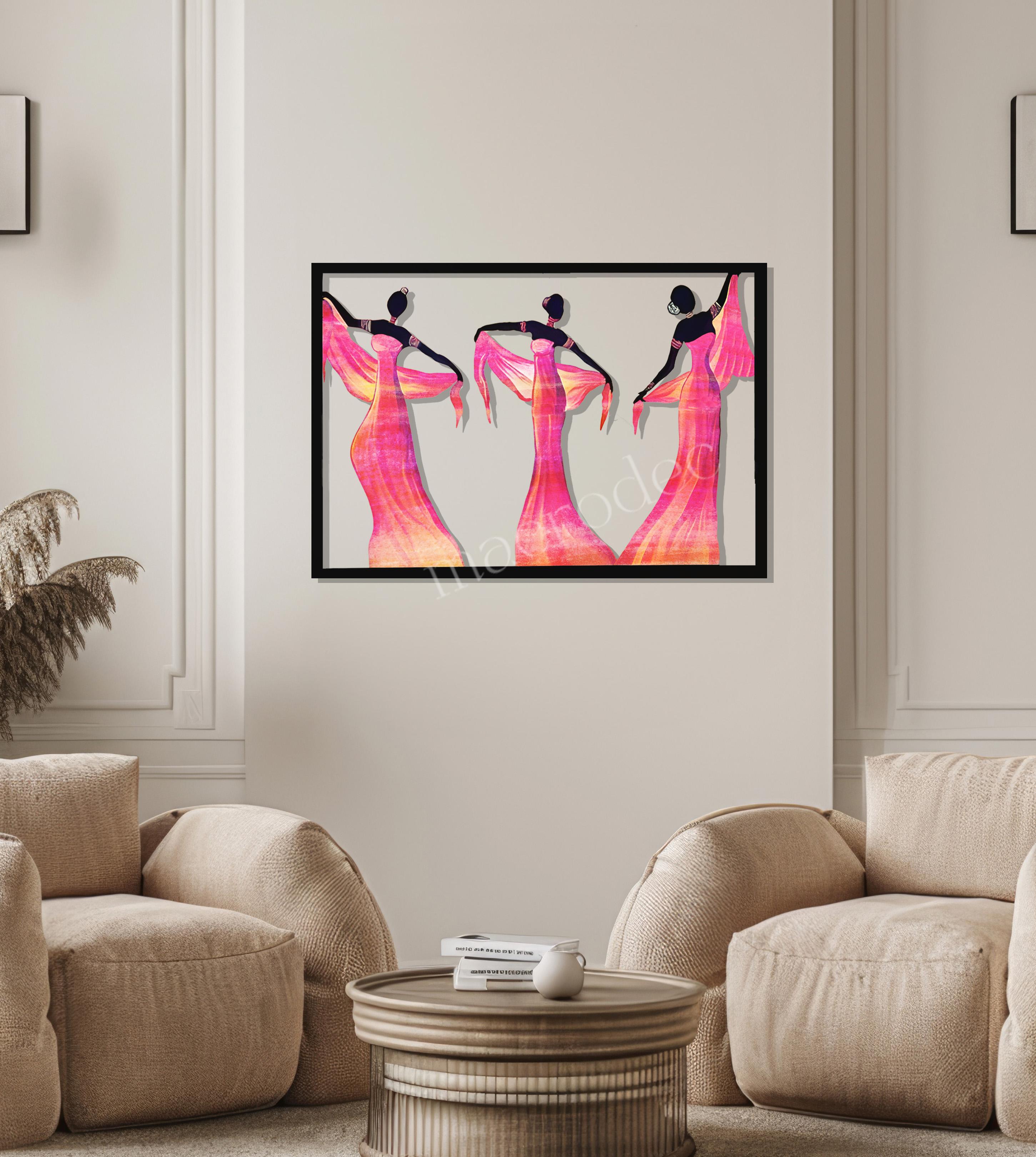 Siyah silüetlerin güçlü duruşu ve elbiselerin akışkan formu, tabloya modern bir denge ve şıklık katar.