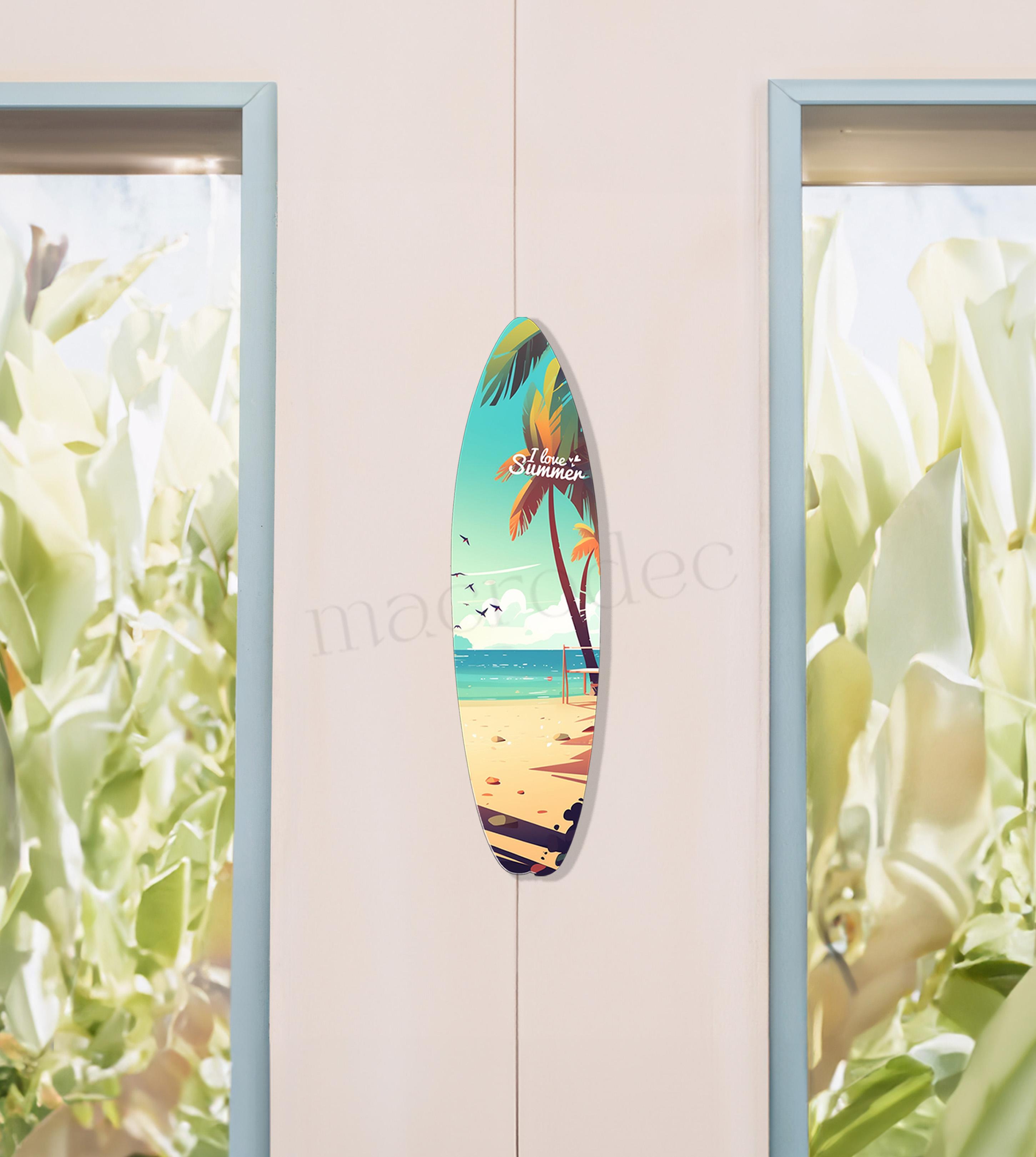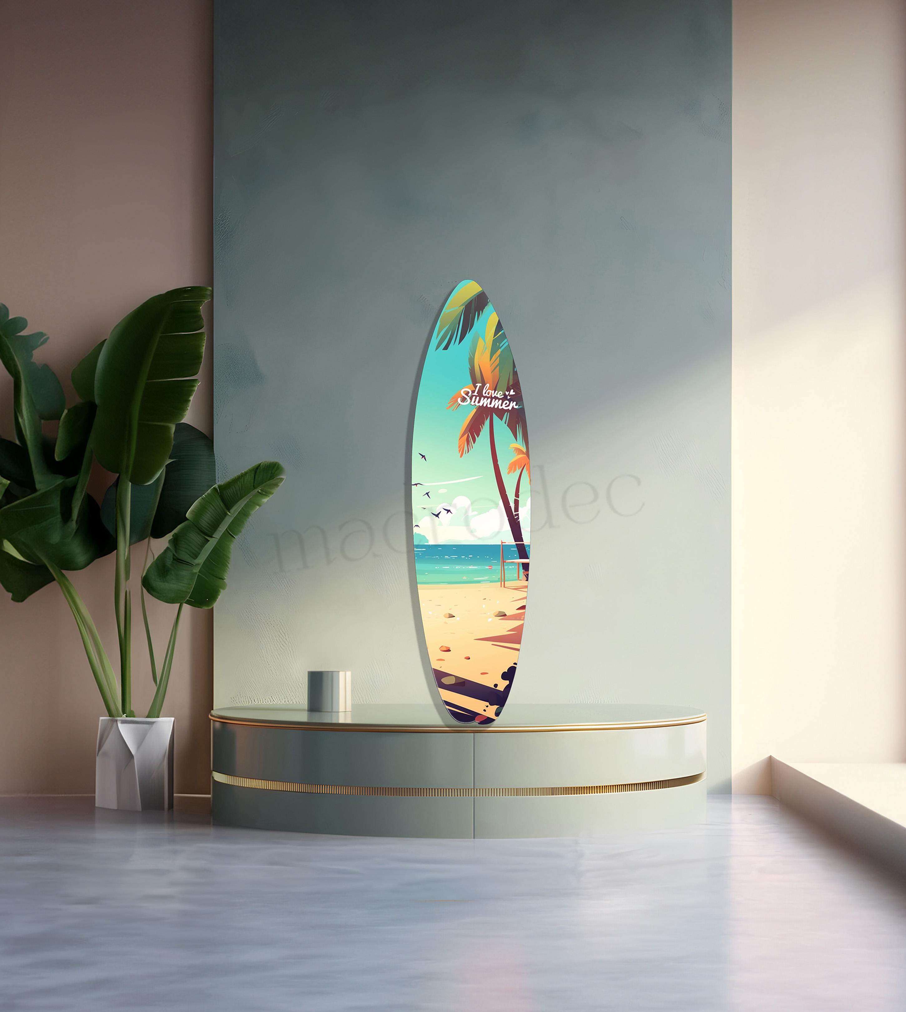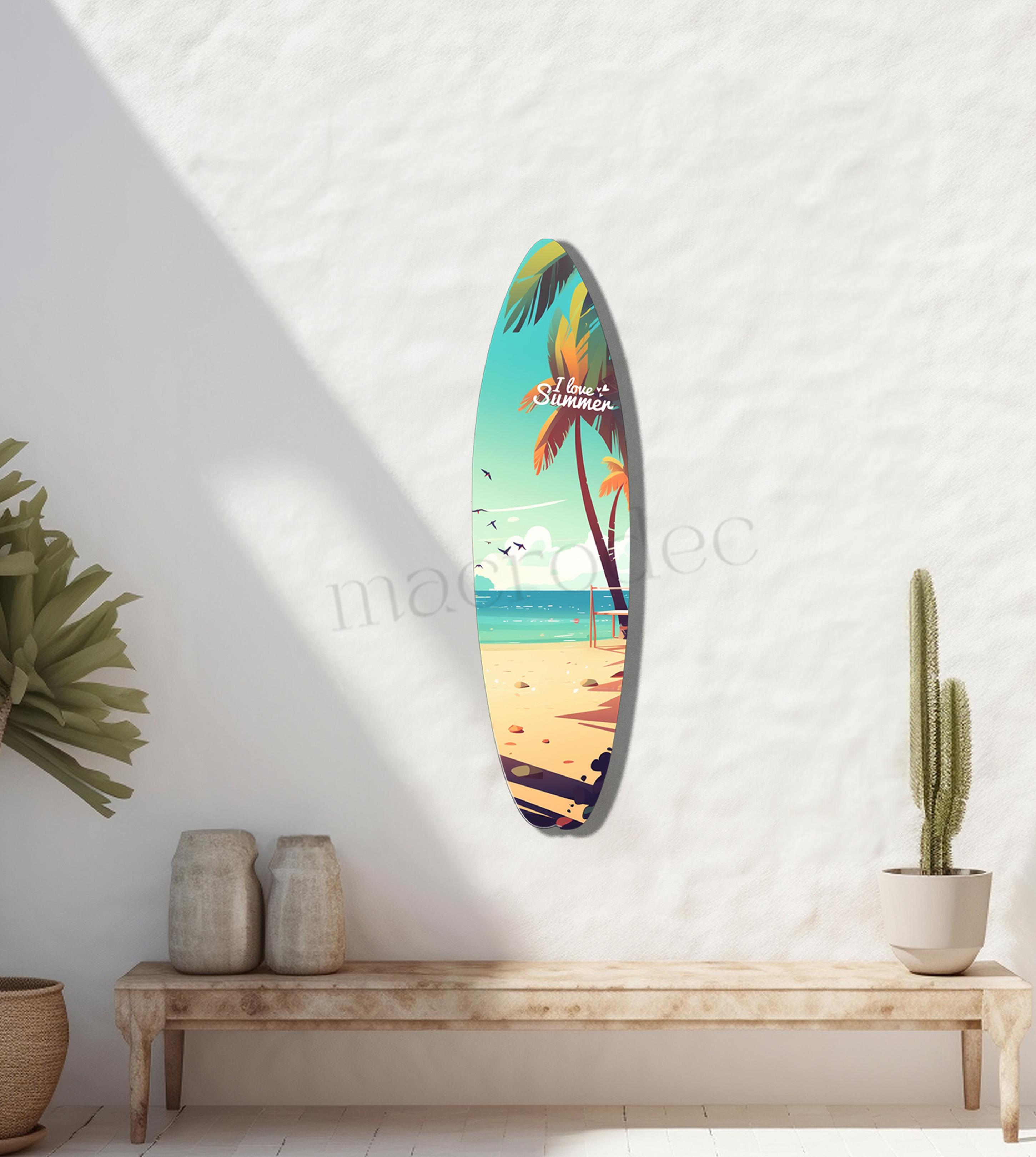 Deniz kokusunu, güneşin sıcaklığını ve tropik esintiyi evinize taşıyan “Tropical Surf” metal tablo, sahil ruhunu yansıtan tek parça surf tahtası tasarımıyla dikkat çeker.